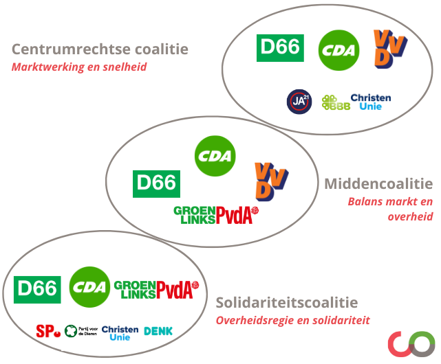 Of we in de toekomst daadwerkelijk kunnen verhuizen naar een Tom de ’s Gravenhage, een Jan Terlouwersoog of een Alexander Pechtoldambt, zal sterk afhangen van de formatie en de coalitie die daar vervolgens uit rolt. Inmiddels namen D66 en CDA het initiatief. Welke partijen sluiten zich bij hen aan? Companen zet alvast drie mogelijke coalities op een rij.