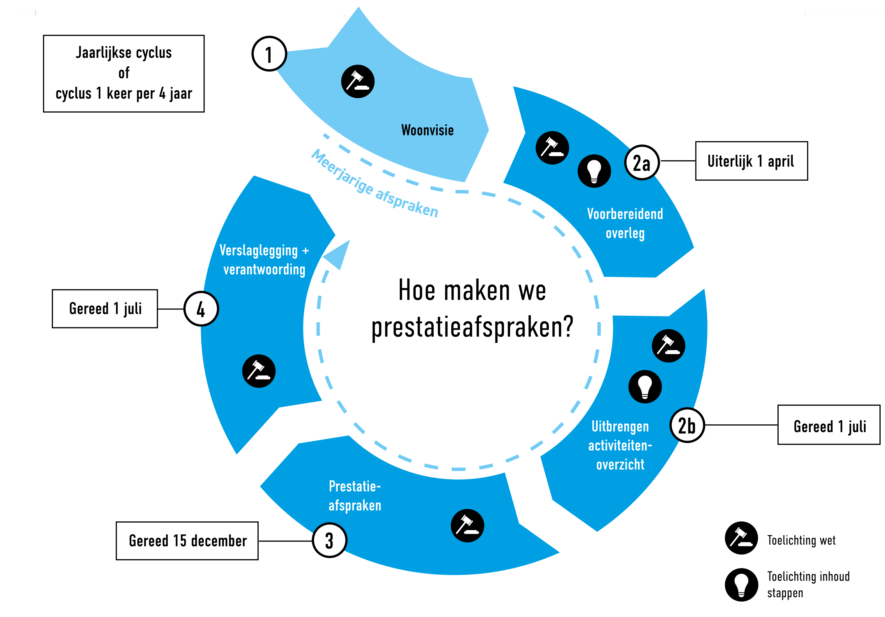 Vanuit onze ervaring is het niet noodzakelijk om jaarlijks alle stappen te doorlopen. Steeds meer gemeenten, corporaties en huurdersorganisaties kiezen voor meerjarige afspraken; voor een periode van vier of vijf jaar. Zeer verstandig! De afgelopen jaren hebben geleerd dat het jaarlijks opnieuw maken van prestatieafspraken veel tijd kost: “Je bent meer bezig met het maken van afspraken dan met de uitvoering”. Bij meerjarige afspraken blijven partijen natuurlijk wel in overleg gedurende de looptijd.